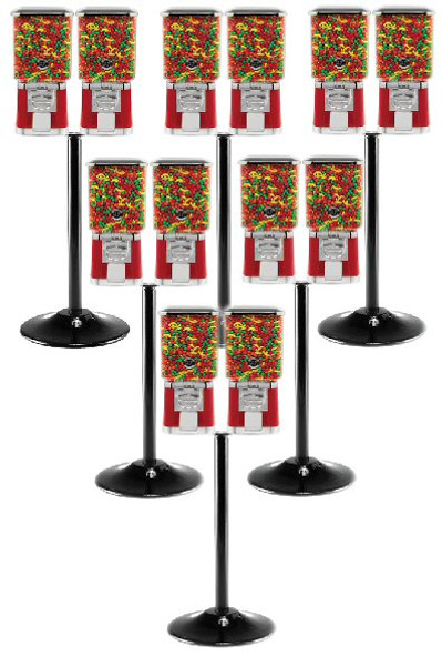 These ten machines will hold approx.260-280lbs. in Candy (approx. 10-12 cases @ 27 lbs. each), 200 lbs. of 1" Gumballs (approx. 10-12 - 850 ct. cases), or 9500 1" Bouncy Balls / Toy Capsules. Be sure to take advantage of our multiple case discounts on our Bulk Gumballs and Bulk Candy to fill these machines.