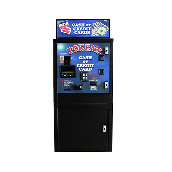 Offer your customers convenience and flexibility with this free-standing, high capacity token dispenser that accepts cash or credit cards in exchange for tokens. With an attractive light-up marquee, this machine is well suited for amusement and other vending applications that utilize tokens. The machine operates on dedicated or non-dedicated phone line, or optional IP connection. It has a 25¢ or $1 coin acceptor along with the credit card reader. It has 4 programmable selections that allow unlimited bonus token payouts. It also comes with a receipt and audit printer and a backlit LCD screen for easy to read instructions. Eligible for 1 year warranty on parts and 2 years on the validator (excepting vandalism).
