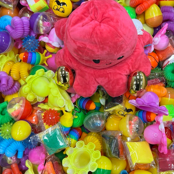 The perfect mix to get you started with your mini crane with a locker box. This kit includes 247 of the most popular items, 2 shiny gold eggs for your locker keys, and one large reversable octopus.