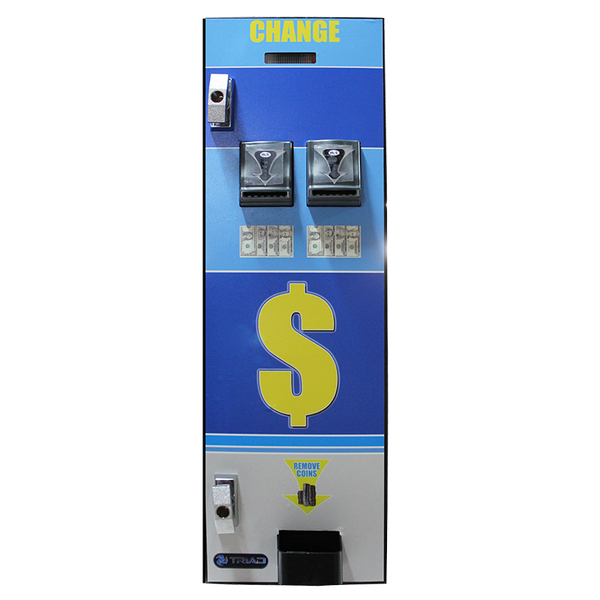 This economical front load changer is ideal for smaller vending and amusement locations. It will accept cash bills and change them into quarters and can also be modified to dispense tokens upon request. This model features two MEI Bill Acceptors that will accept $1, $5, $10, and $20 bills. The high visibility bezel validator will catch the attention of the customer by using lights. In addition, the validators include the recycling feature which allows customers who use larger bills to receive bank notes back with their change. The spool holds 30 $1 bills and 30 $5 bills and will replenish itself when customers inserts one of these kinds of bills. This machine also includes two hoppers which hold 5,600 quarters each and two 500 note stackers. This machine is great for pool halls, laundromats, and car washes. Eligible for 1 year warranty and made in the USA!