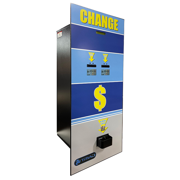 This economical rear load changer is ideal for smaller vending and amusement locations. It will accept cash bills and change them into quarters and can also be modified to dispense tokens upon request. This model features two MEI Bill Acceptors that will accept $1, $5, $10, and $20 bills. The high security bezel validator will have a smaller mouth piece and is more durable than the standard. In addition, the validators include the recycling feature which allows customers who use larger bills to receive bank notes back with their change. The spool holds 30 $1 bills and 30 $5 bills and will replenish itself when customers inserts one of these kinds of bills. This machine also includes two hoppers which hold 5,600 quarters each and two 500 note stackers. This machine is great for pool halls, laundromats, and car washes. Eligible for 1 year warranty and made in the USA!