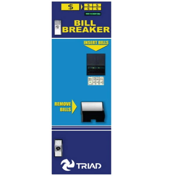 This state of the art front load machine is ideal for smaller vending and amusement locations. The Triad 500FL Triple Front Load Bill Breaker will accept a large bill and break it down into smaller denominations. The model comes equipped with one premier MEI Bill Acceptor that accepts $1, $5, $10 and $20 Bills, as well as three cassettes which hold 500 bills each for a total of 1,500 bills. This machine is great for pool halls, laundromats, and car washes. Eligible for 1 year warranty and made in the USA!